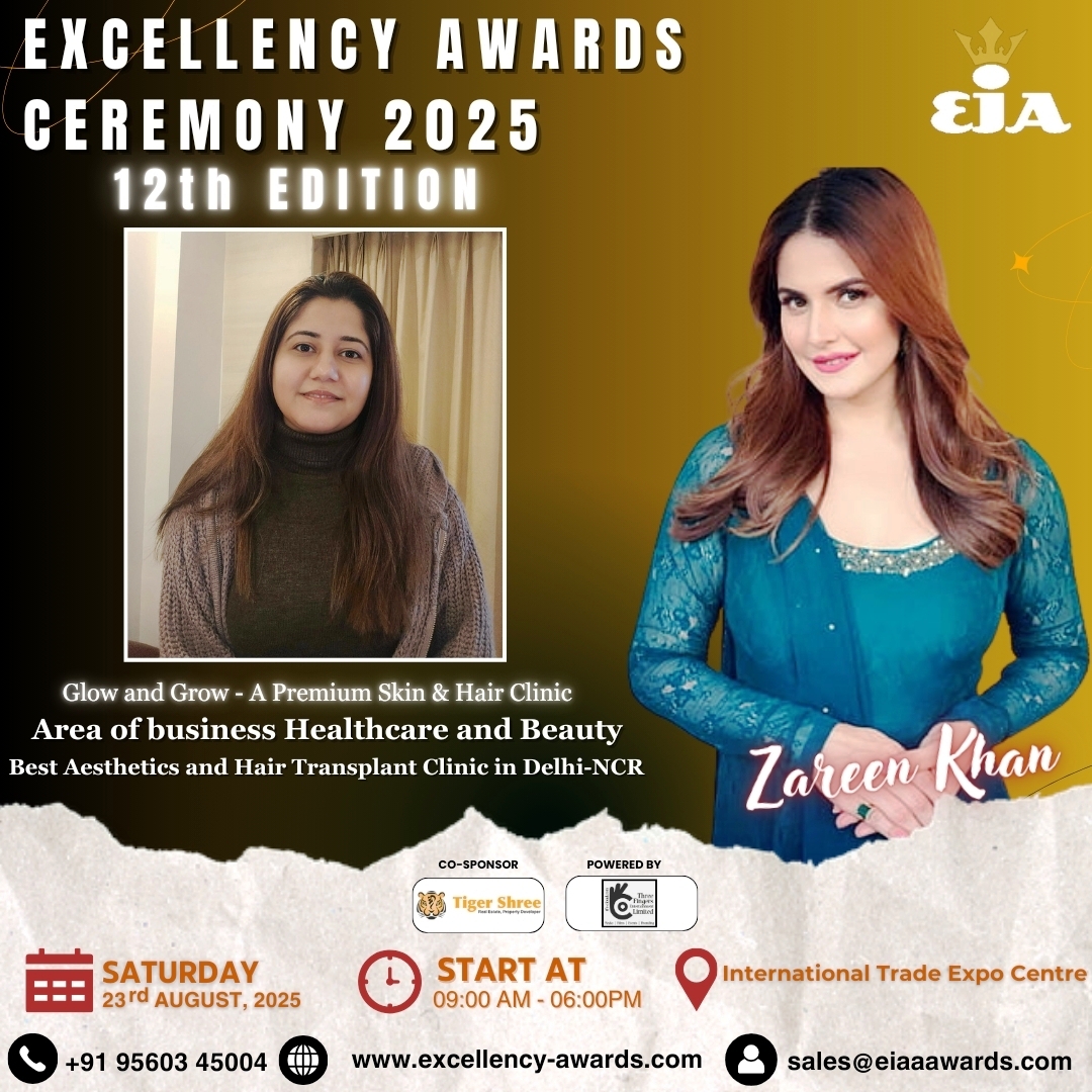 We are pleased to announce that Glow & Grow – A Premium Skin & Hair Clinic has been honored with the distinction of Best Aesthetics & Hair Transplant Clinic in Delhi-NCR at the esteemed Excellency Iconic Awards, presented by renowned celebrity guest Zareen Khan.